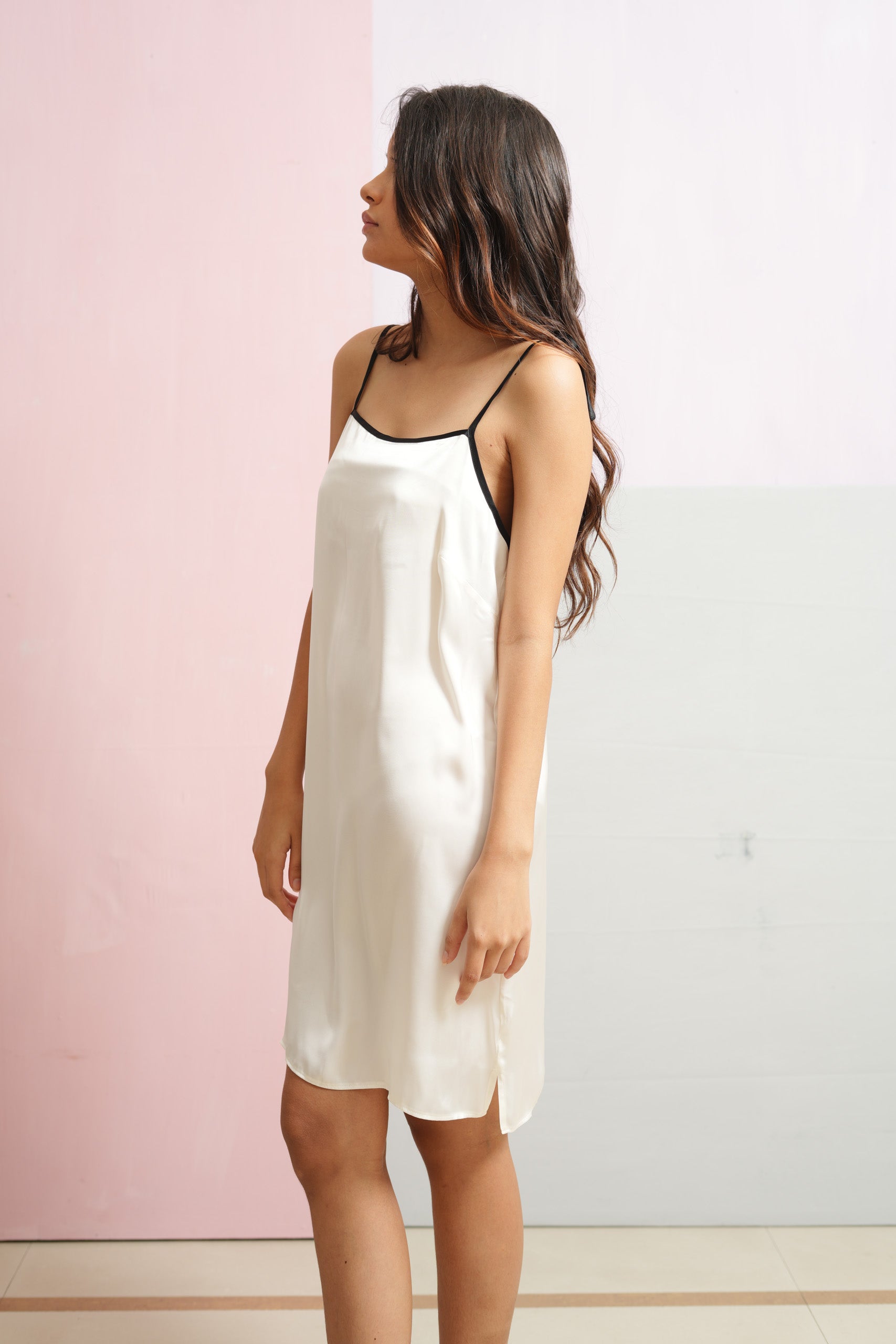 Short slip dress in satin. Adjustable, contrast shoulder straps with a bow detail & straight neckline .