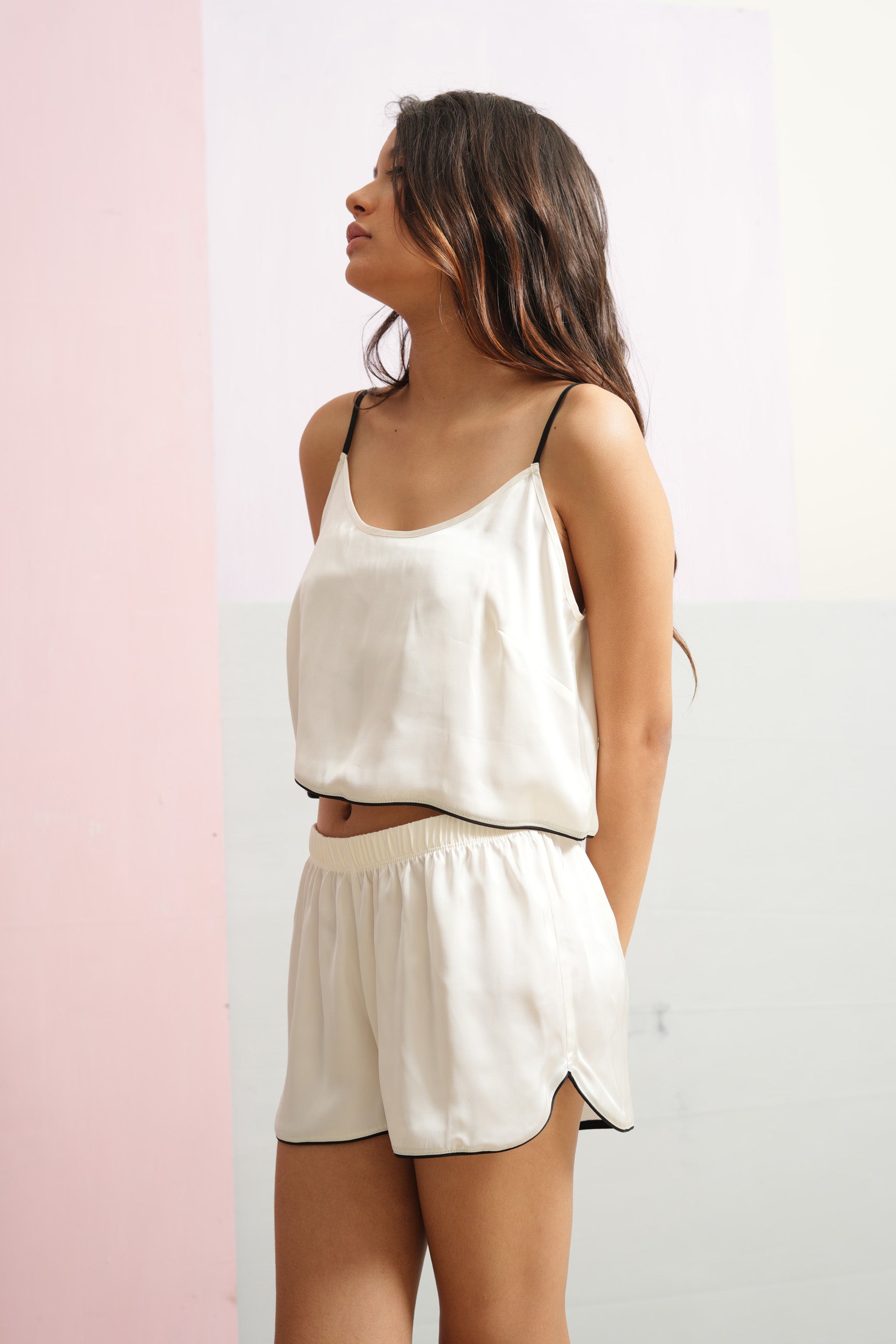 Pajamas with a camisole top and shorts in satin. Top with contrast adjustable, shoulder straps. Curved neckline with a contrast pipping detail at hem.. Bpard shorts with elastic at waistband & contrast pipping at the hemline.