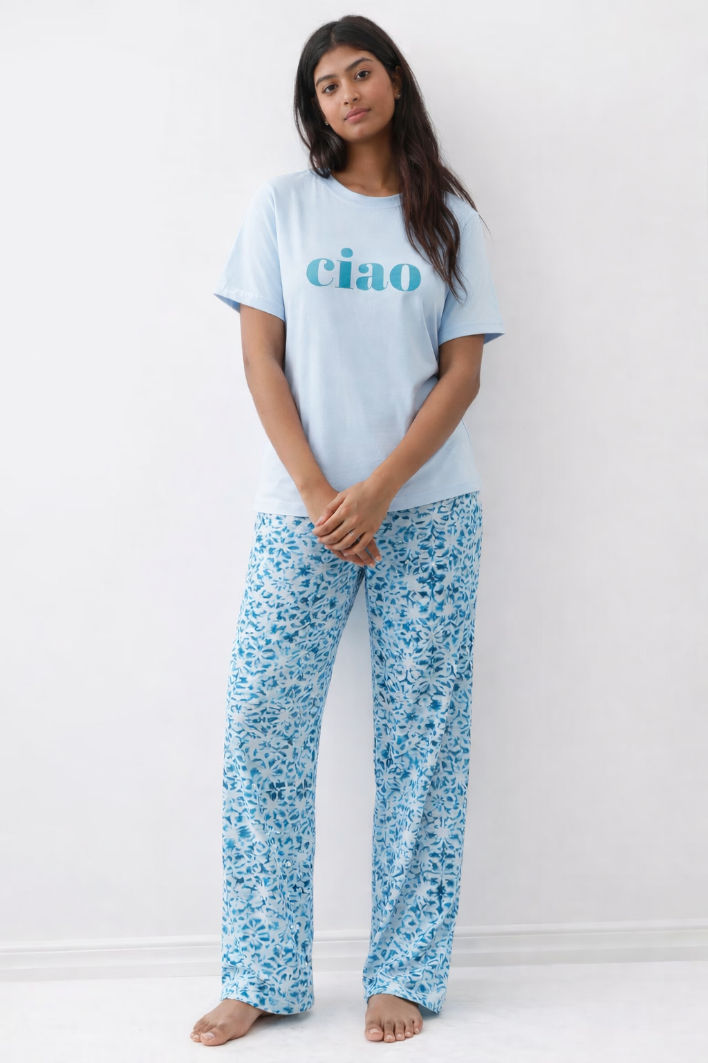 Short Description: The SEDA Ciao Ladies Short Sleeve Pant Set is crafted for women who value comfort and style in their sleepwear. Made from soft, breathable fabrics, this lightweight set is gentle on the skin and suitable for all-night wear. Featuring a solid short sleeve top with a playful "Ciao" print and coordinated full-length printed pants, this set delivers relaxed comfort with a touch of modern sophistication.