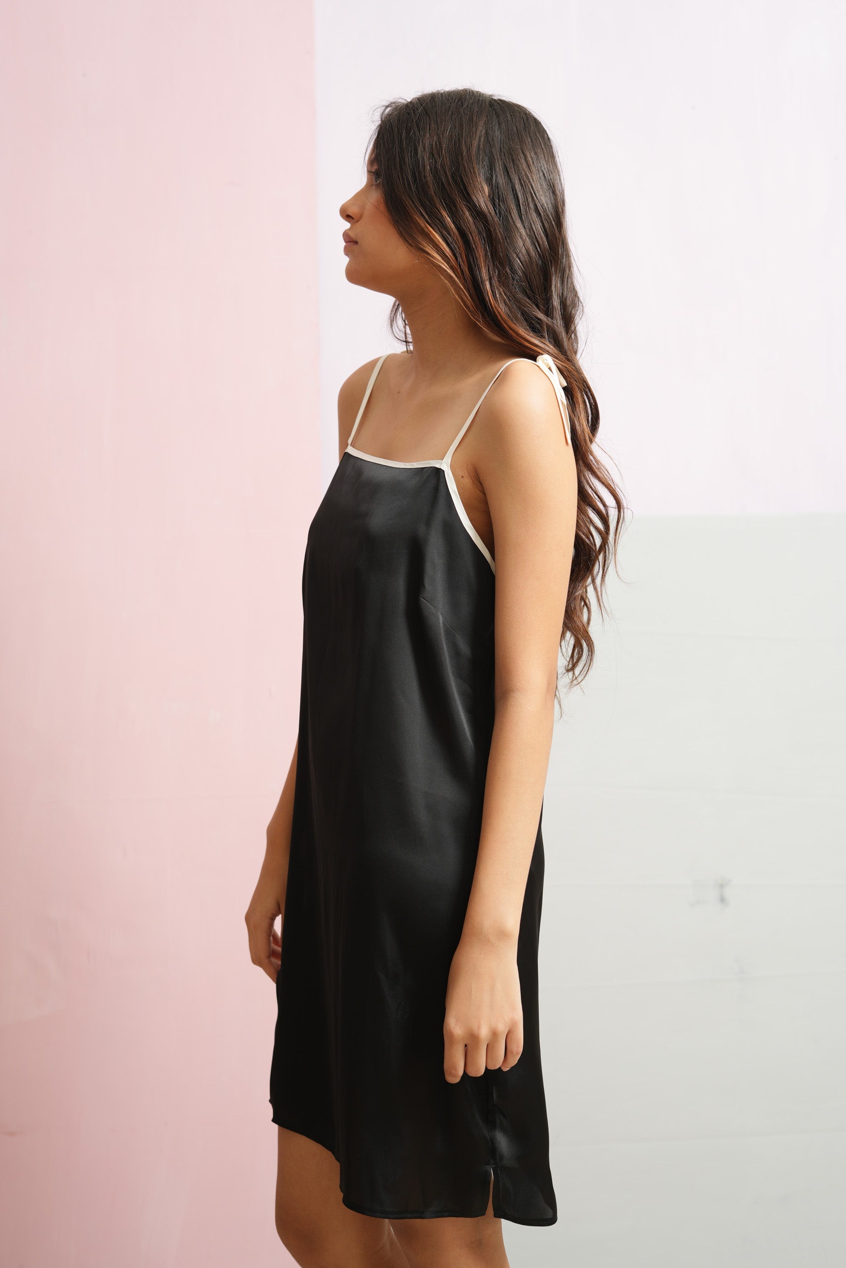 Short slip dress in satin. Adjustable, contrast shoulder straps with a bow detail & straight neckline .