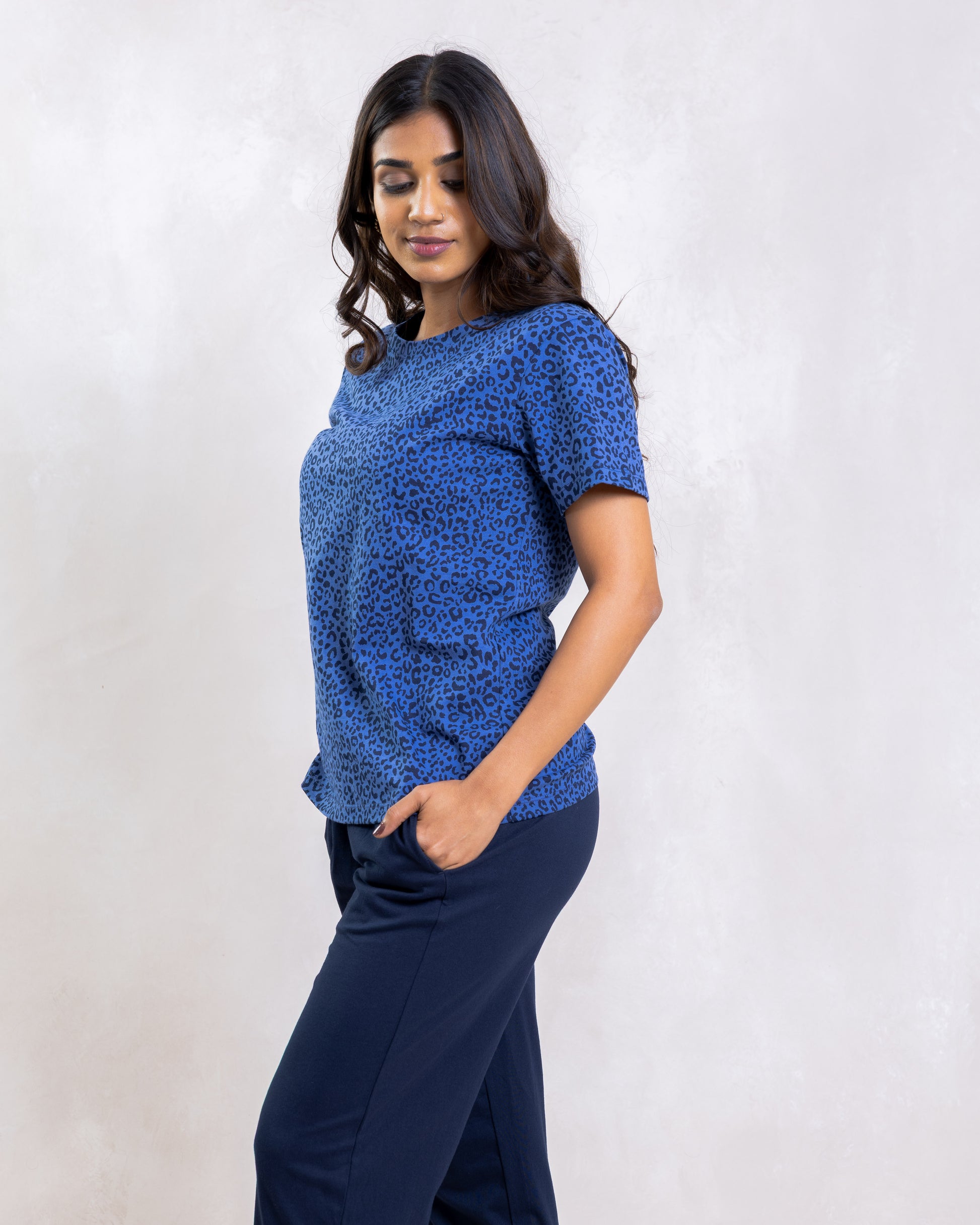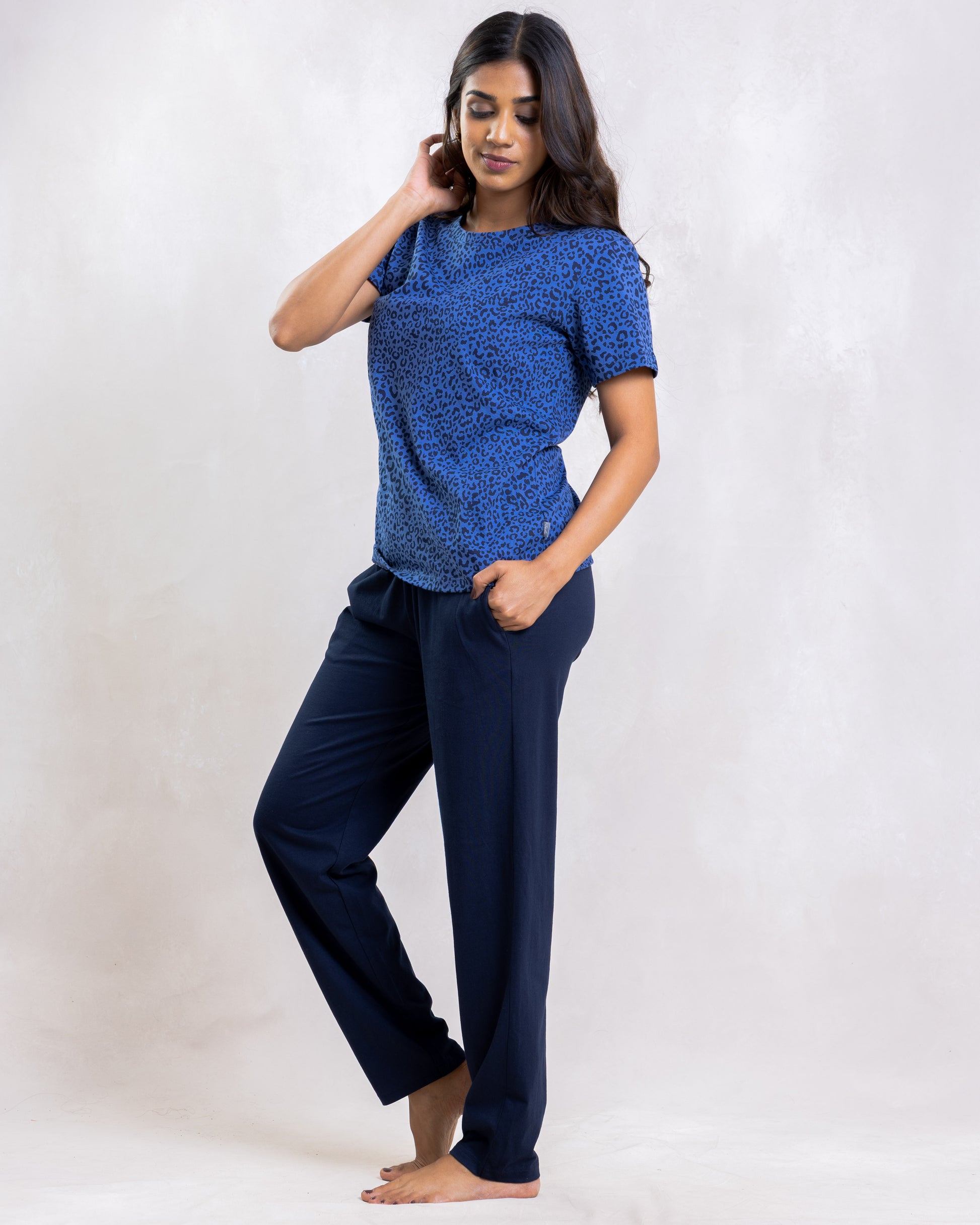 Featuring a bold blue leopard print short sleeve top paired with matching coordinated pants, this set delivers relaxed comfort with a touch of playful sophistication. Designed for lounging, casual nights, or restful sleep, it ensures ease of movement and a cozy fit for everyday use.