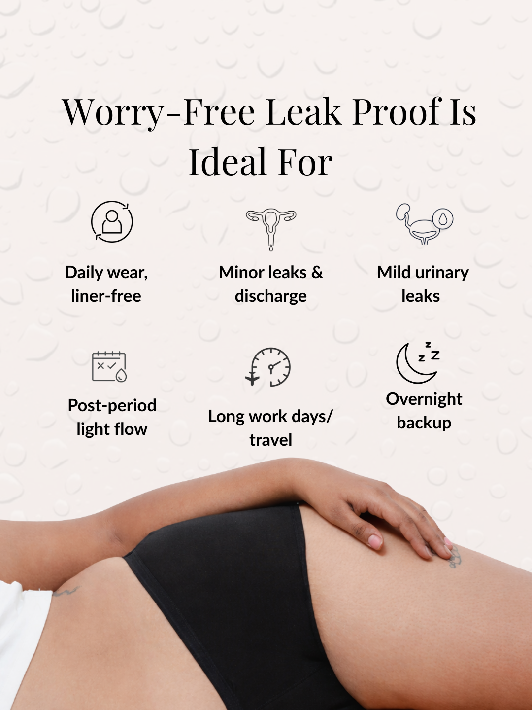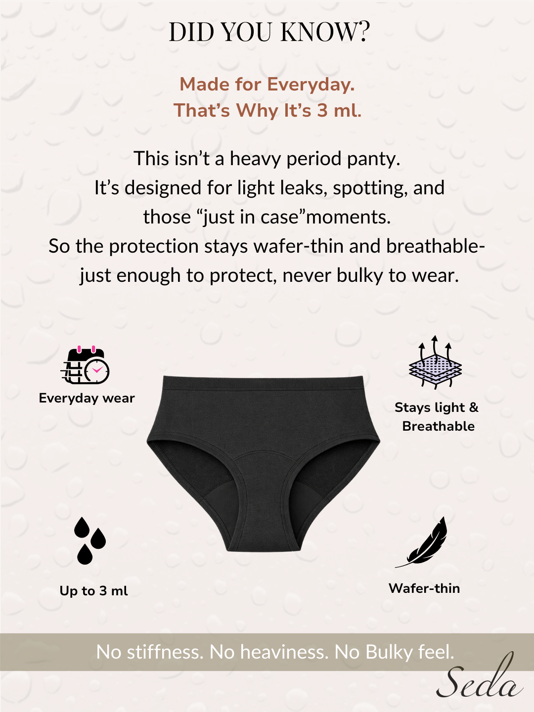 • Discreet Absorption: Absorbs up to 3ml with a built-in liner that locks in moisture while keeping the outer fabric dry.